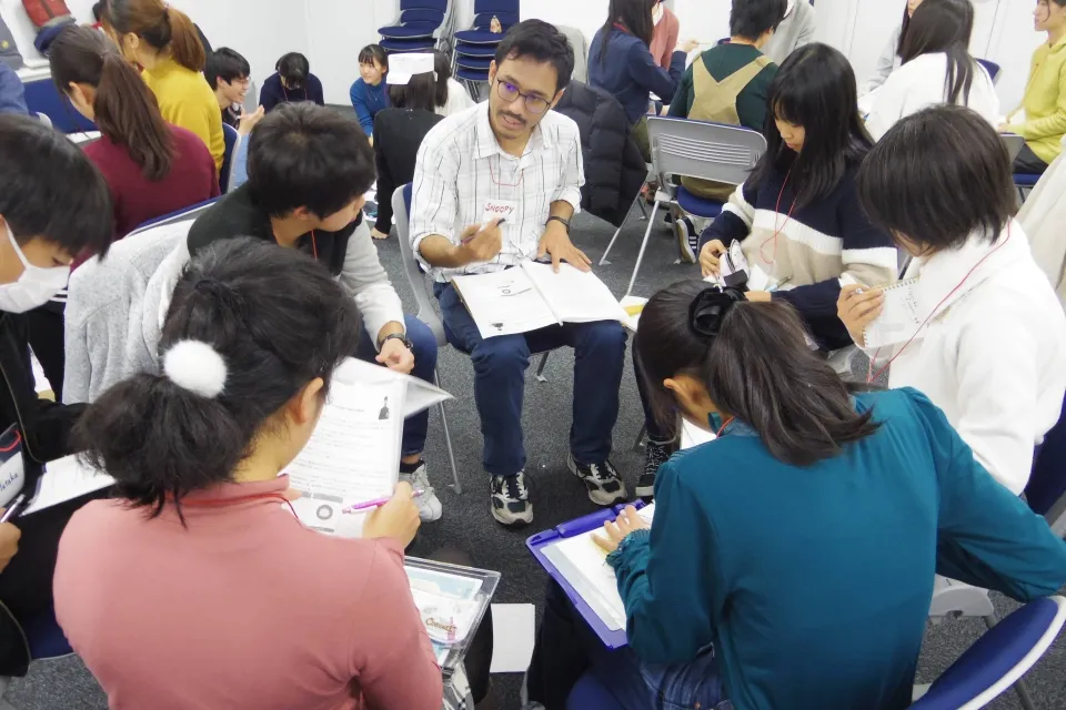 5〜6名に1名の留学生がグループをリードし、講師が全体を統括。対話中心の学びを通して、英語で考え、意見を伝え、深め合う経験を重ねることで、実践的な英語力と自信を着実に育てます。