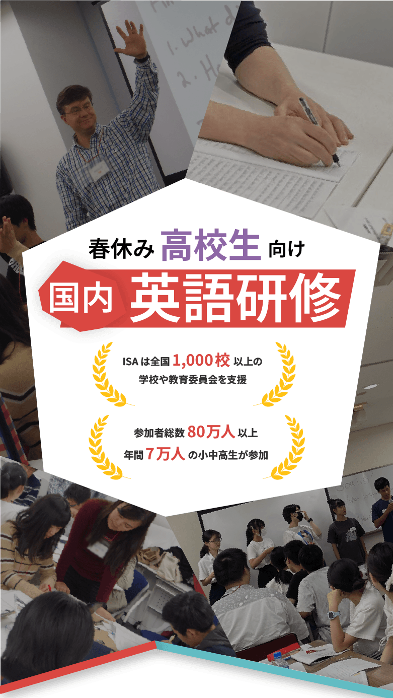 ISAが国内で実施するイングリッシュキャンプは、外国人講師による指導のもと、日本にいながらにして国際交流を経験し、<英語によるコミュニケーション力><異文化に対する理解><国際社会で活躍するために求められるスキル>を積極的に、かつ楽しく身につけることを目的としています。