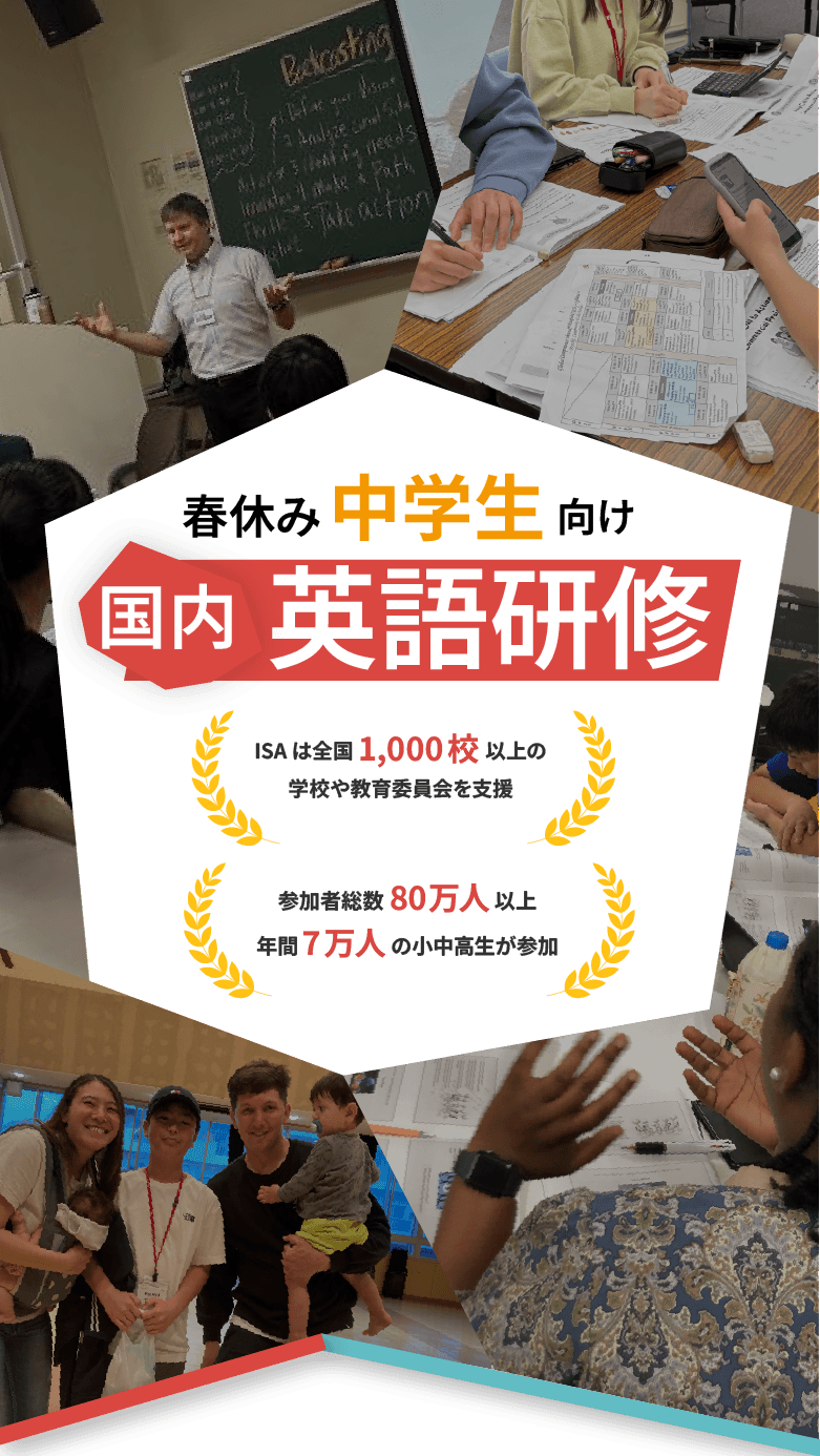 ISAが国内で実施するイングリッシュキャンプは、外国人講師による指導のもと、日本にいながらにして国際交流を経験し、<英語によるコミュニケーション力><異文化に対する理解><国際社会で活躍するために求められるスキル>を積極的に、かつ楽しく身につけることを目的としています。