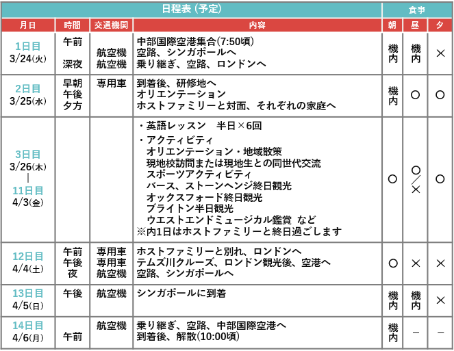 食事 [機内] 機内食 [○] 滞在先、手配あり [✕] 各自負担 (団体行動中に購入します)