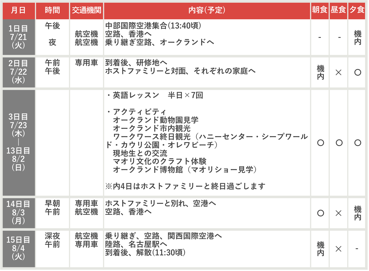 食事 [機内] 機内食 [○] 滞在先、手配あり [✕] 各自負担 (団体行動中に購入します)