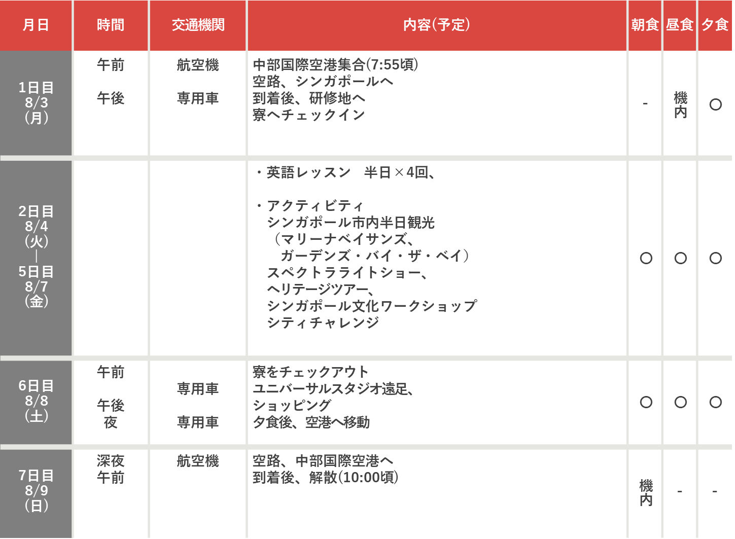 食事 [機内] 機内食 [○] 滞在先、手配あり [✕] 各自負担 (団体行動中に購入します)