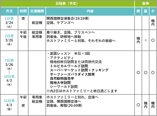 食事 [機内] 機内食 [○] 滞在先、手配あり [✕] 各自負担 (団体行動中に購入します)