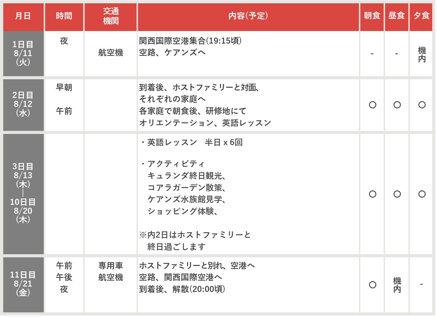 食事 [機内] 機内食 [○] 滞在先、手配あり [✕] 各自負担 (団体行動中に購入します)