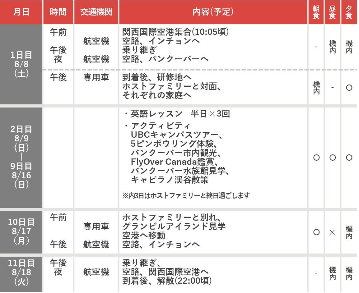 食事 [機内] 機内食 [○] 滞在先、手配あり [✕] 各自負担 (団体行動中に購入します)