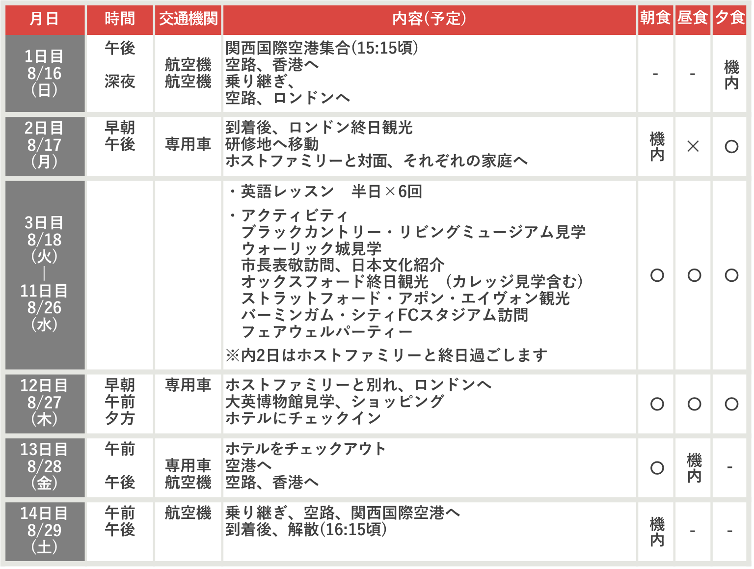 食事 [機内] 機内食 [○] 滞在先、手配あり [✕] 各自負担 (団体行動中に購入します)