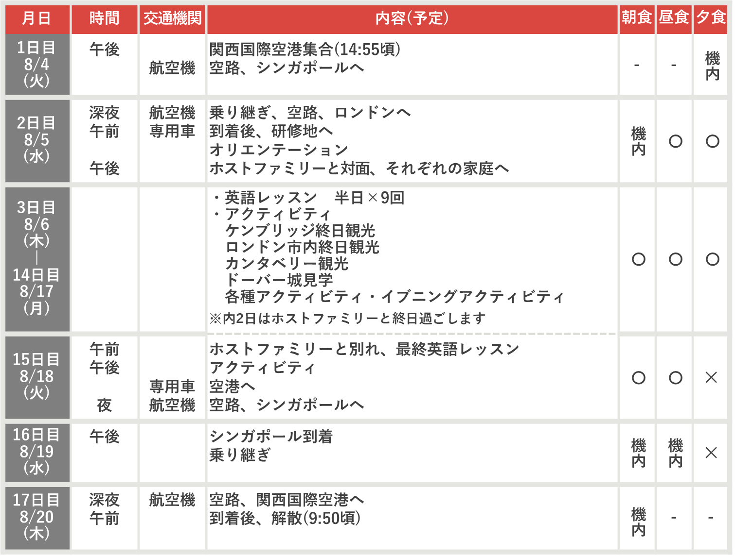 食事 [機内] 機内食 [○] 滞在先、手配あり [✕] 各自負担 (団体行動中に購入します)