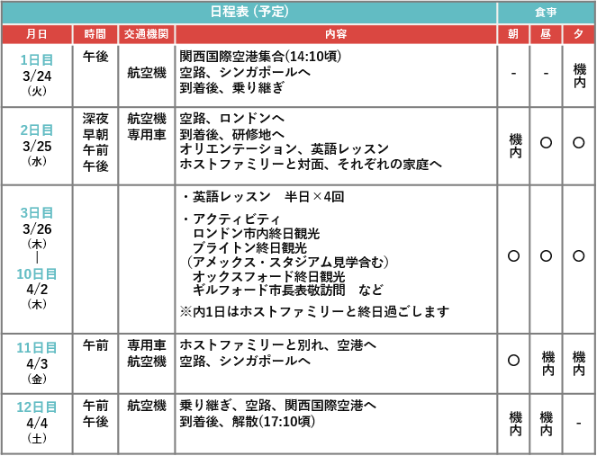 食事 [機内] 機内食 [○] 滞在先、手配あり [✕] 各自負担 (団体行動中に購入します)
