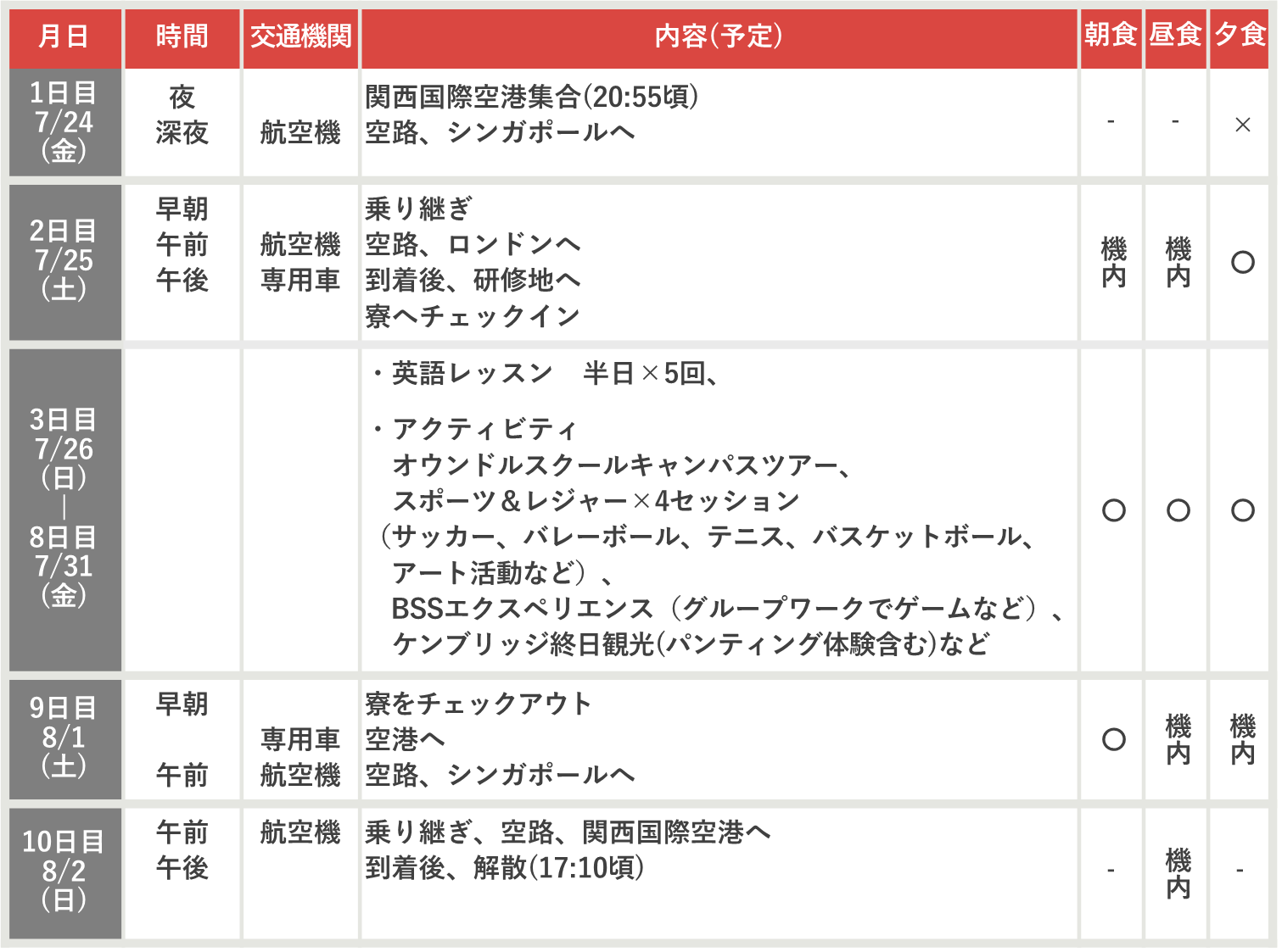 食事 [機内] 機内食 [○] 滞在先、手配あり [✕] 各自負担 (団体行動中に購入します)