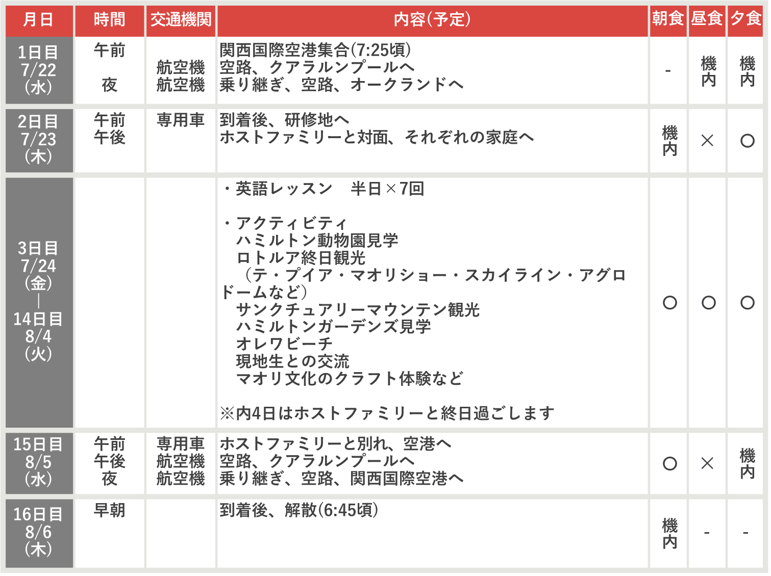食事 [機内] 機内食 [○] 滞在先、手配あり [✕] 各自負担 (団体行動中に購入します)