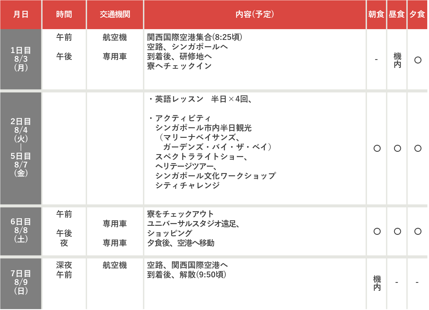 食事 [機内] 機内食 [○] 滞在先、手配あり [✕] 各自負担 (団体行動中に購入します)