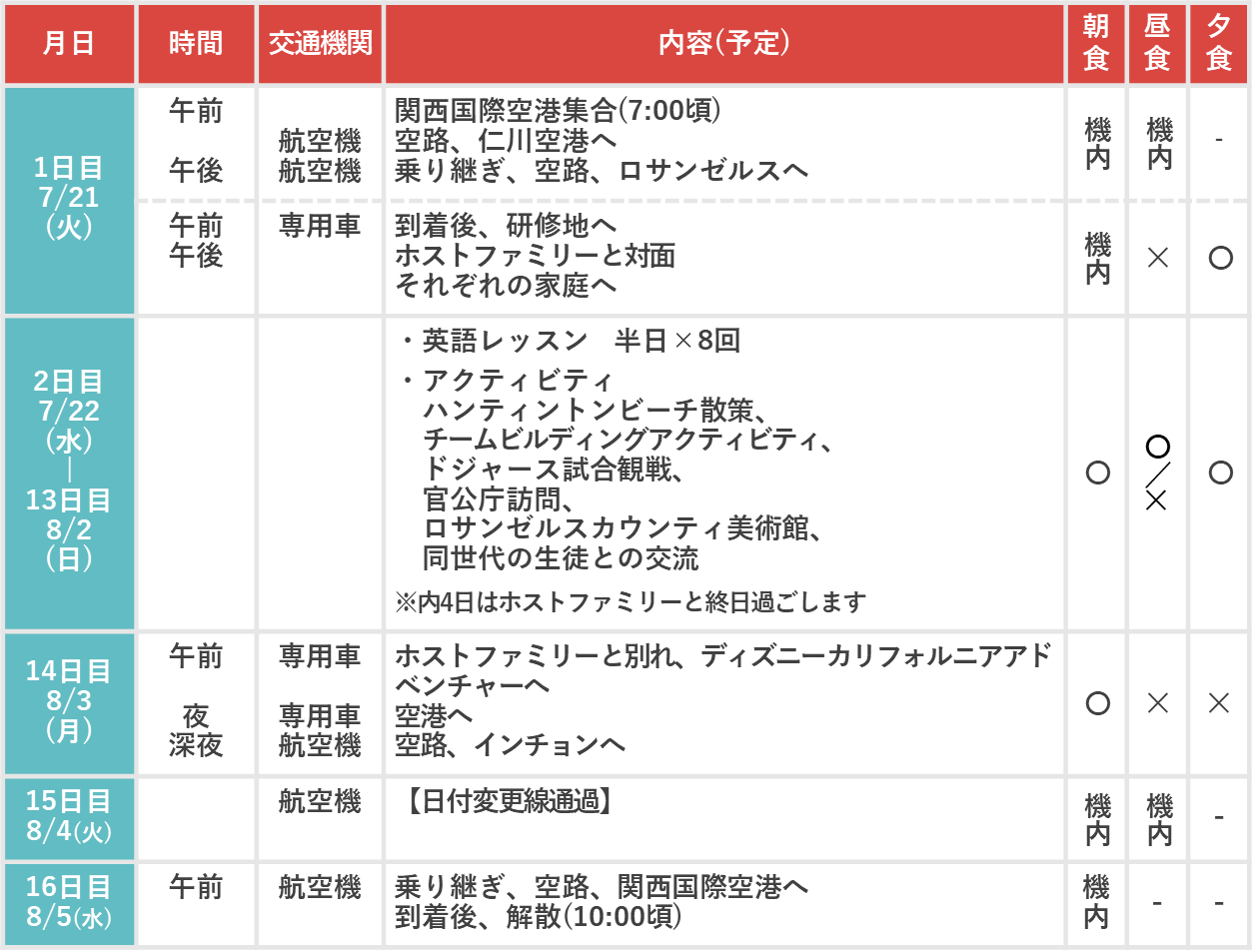 食事 [機内] 機内食 [○] 滞在先、手配あり [✕] 各自負担 (団体行動中に購入します)