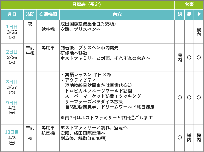 食事 [機内] 機内食 [○] 滞在先、手配あり [✕] 各自負担 (団体行動中に購入します)