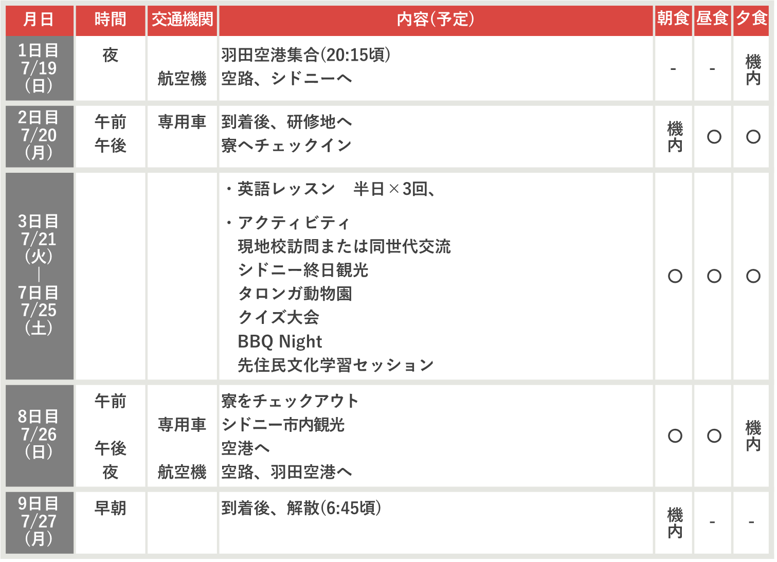 食事 [機内] 機内食 [○] 滞在先、手配あり [✕] 各自負担 (団体行動中に購入します)