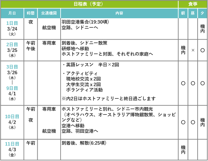 食事 [機内] 機内食 [○] 滞在先、手配あり [✕] 各自負担 (団体行動中に購入します)