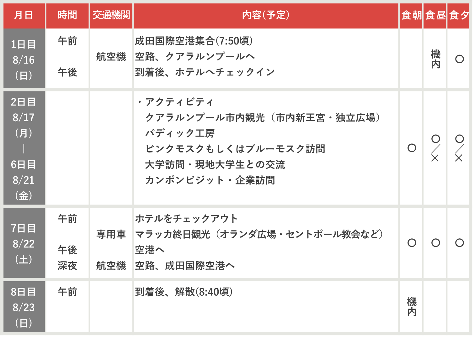 食事 [機内] 機内食 [○] 滞在先、手配あり [✕] 各自負担 (団体行動中に購入します)