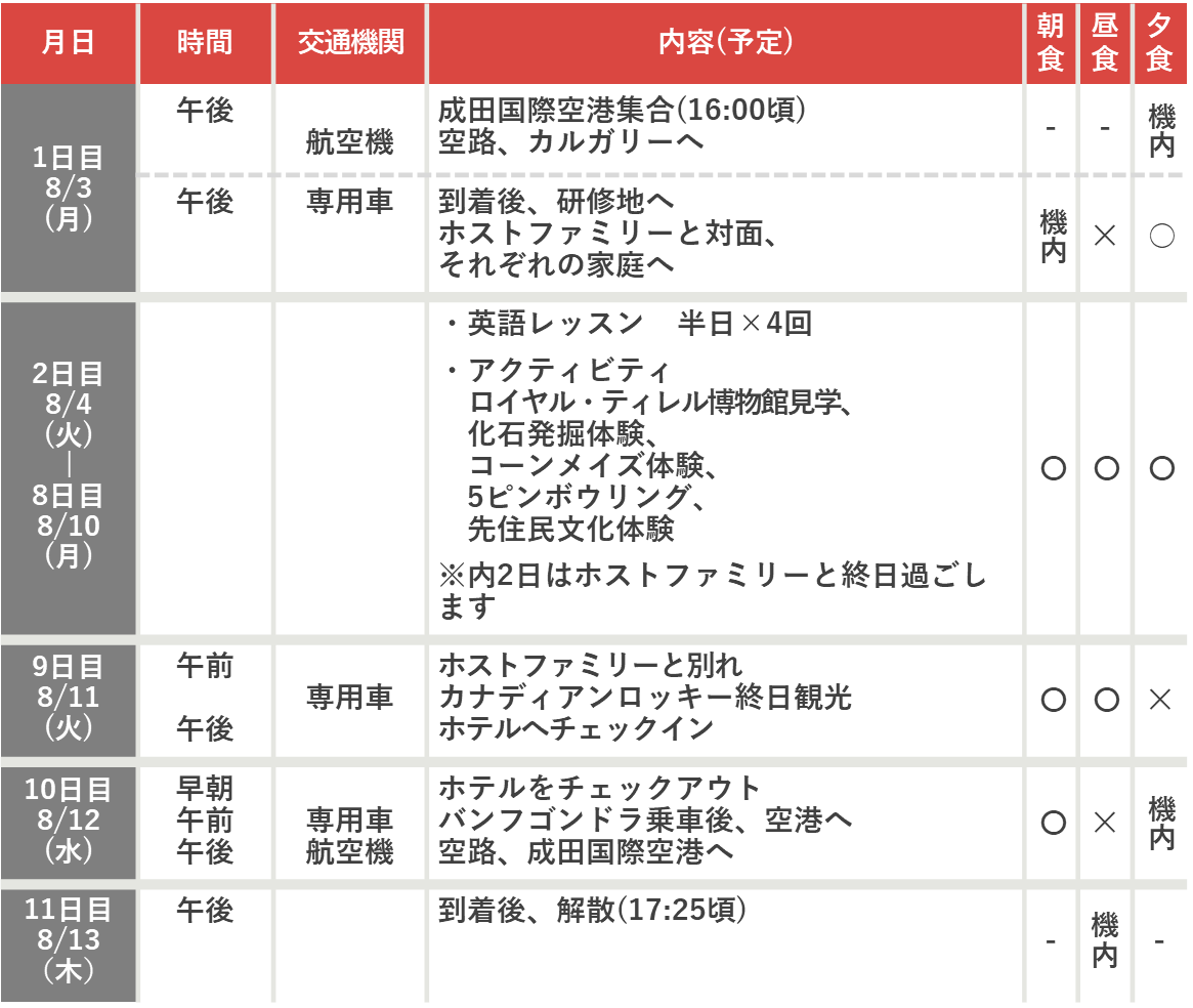 食事 [機内] 機内食 [○] 滞在先、手配あり [✕] 各自負担 (団体行動中に購入します)