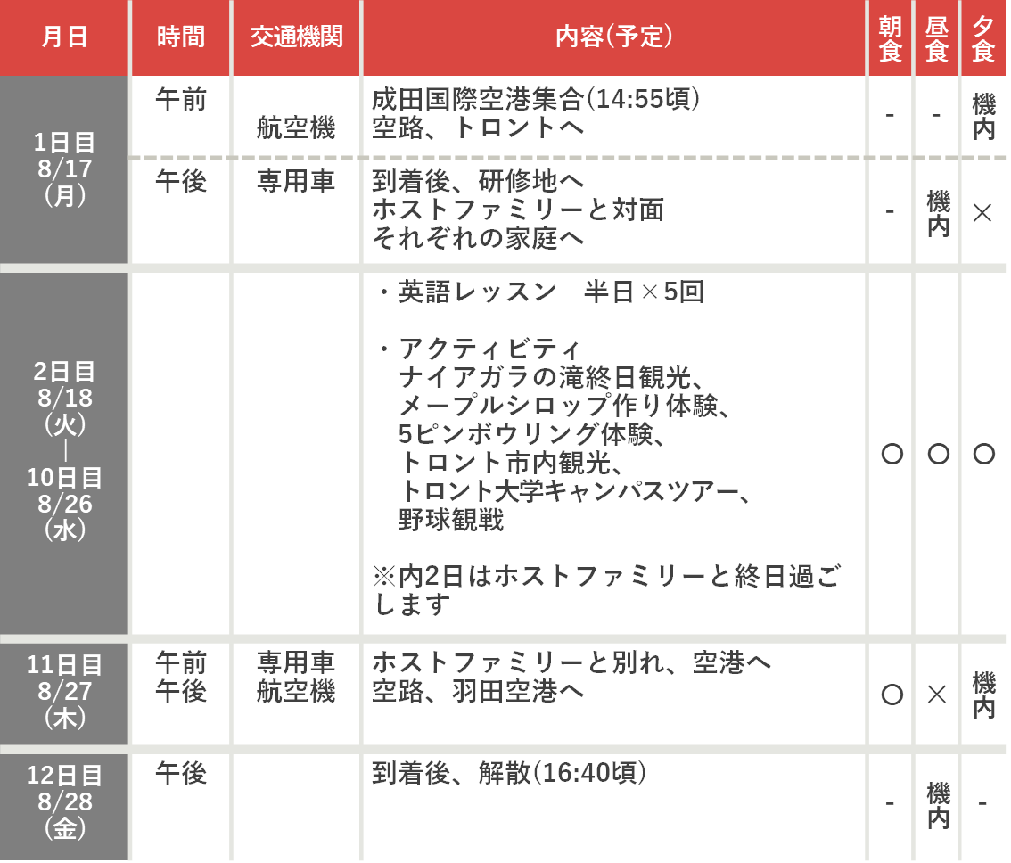 カナダ東海岸の大都市トロント郊外でホームステイを体験。世界三大瀑布のナイアガラの滝では、遊覧船霧の乙女号に乗船して、滝つぼ近くまで水しぶきを浴びながら大迫力の風景を楽しみます。大リーグ観戦や世界の名門トロント大学のキャンパスツアーなど、文武両方を楽しめるプログラムです。