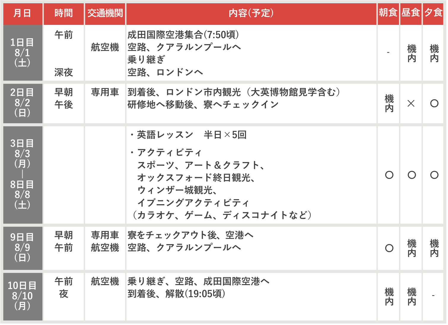 食事 [機内] 機内食 [○] 滞在先、手配あり [✕] 各自負担 (団体行動中に購入します)