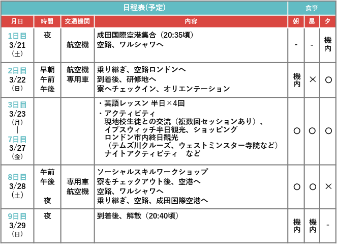 食事 [機内] 機内食 [○] 滞在先、手配あり [✕] 各自負担 (団体行動中に購入します)