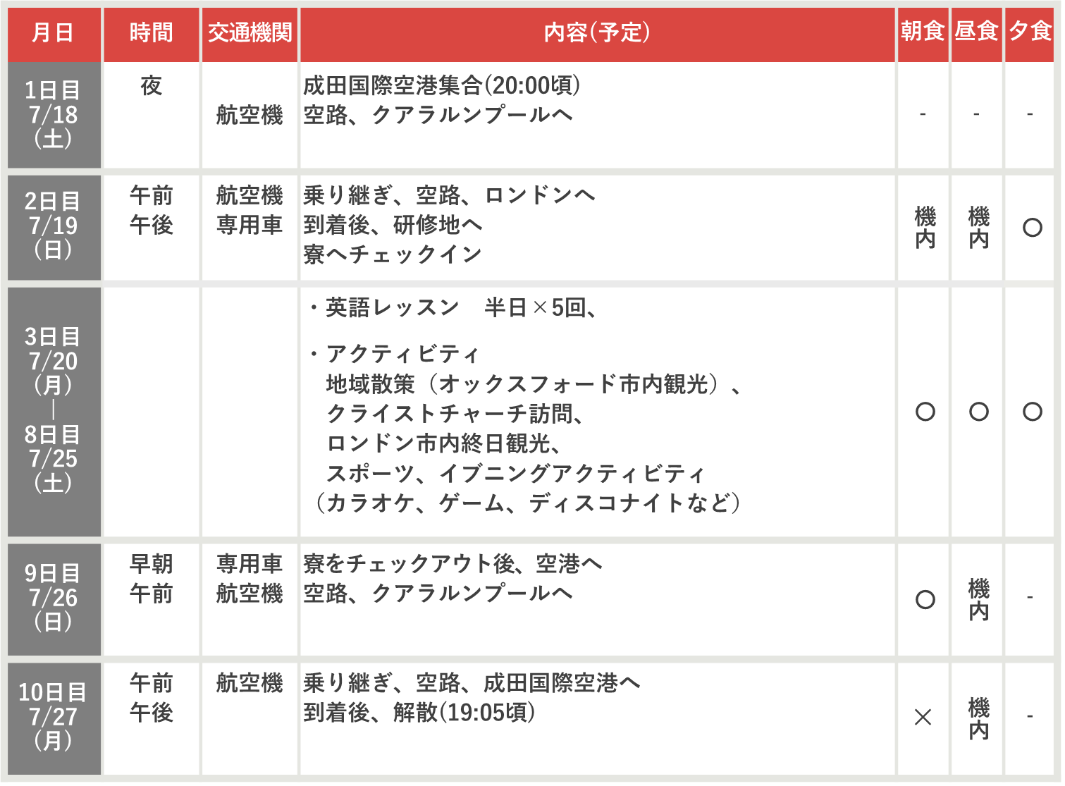 食事 [機内] 機内食 [○] 滞在先、手配あり [✕] 各自負担 (団体行動中に購入します)