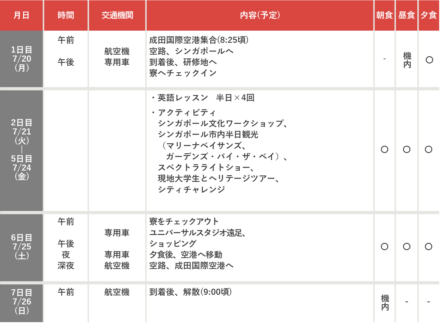 食事 [機内] 機内食 [○] 滞在先、手配あり [✕] 各自負担 (団体行動中に購入します)