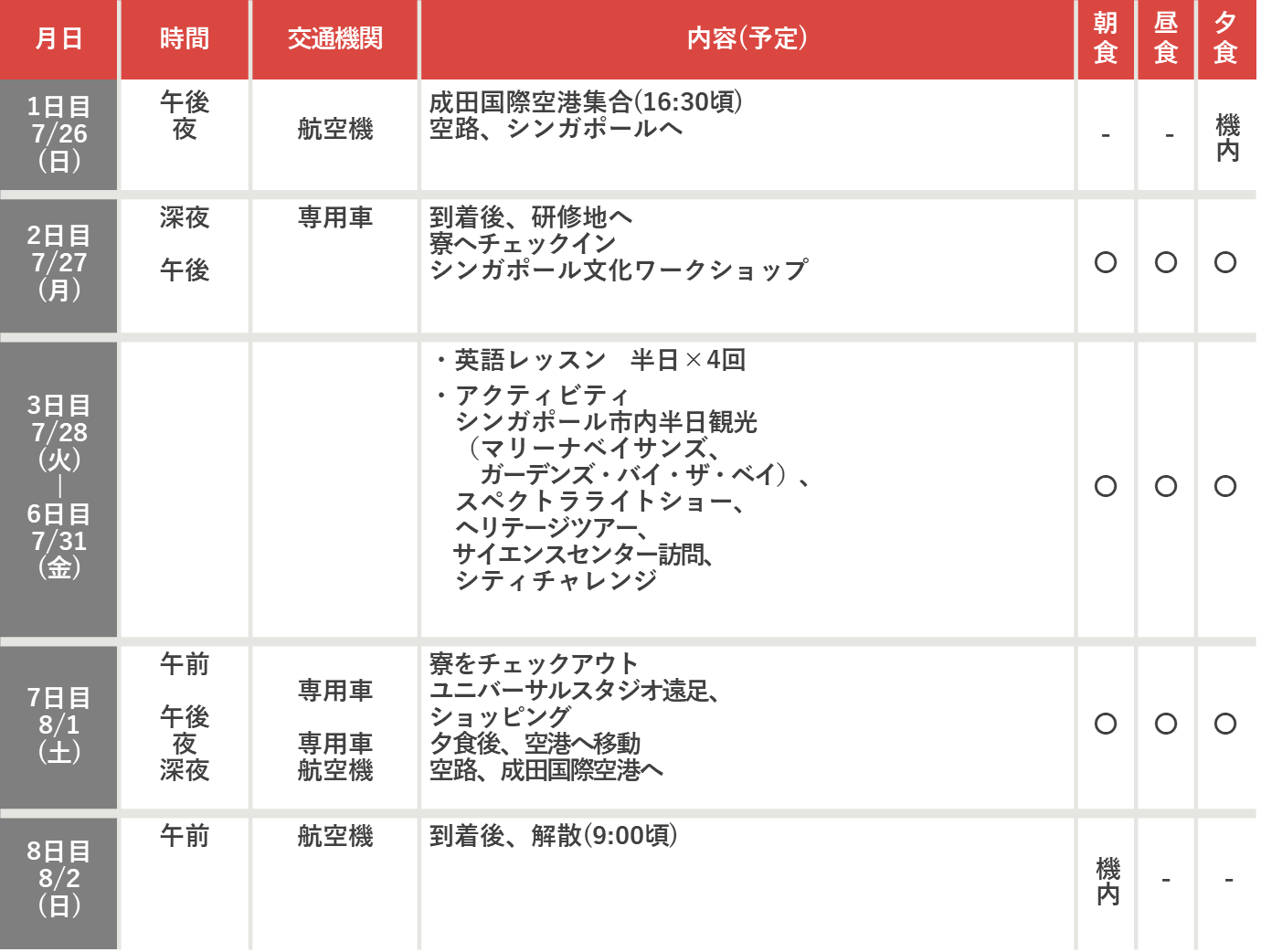 食事 [機内] 機内食 [○] 滞在先、手配あり [✕] 各自負担 (団体行動中に購入します)
