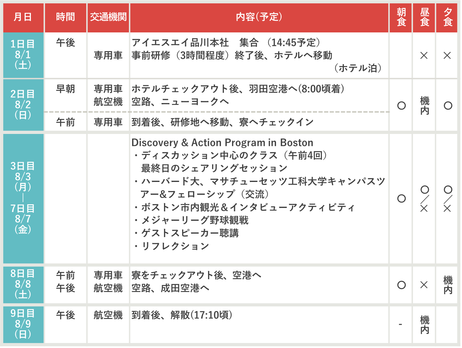 食事 [機内] 機内食 [○] 滞在先、手配あり [✕] 各自負担 (団体行動中に購入します)