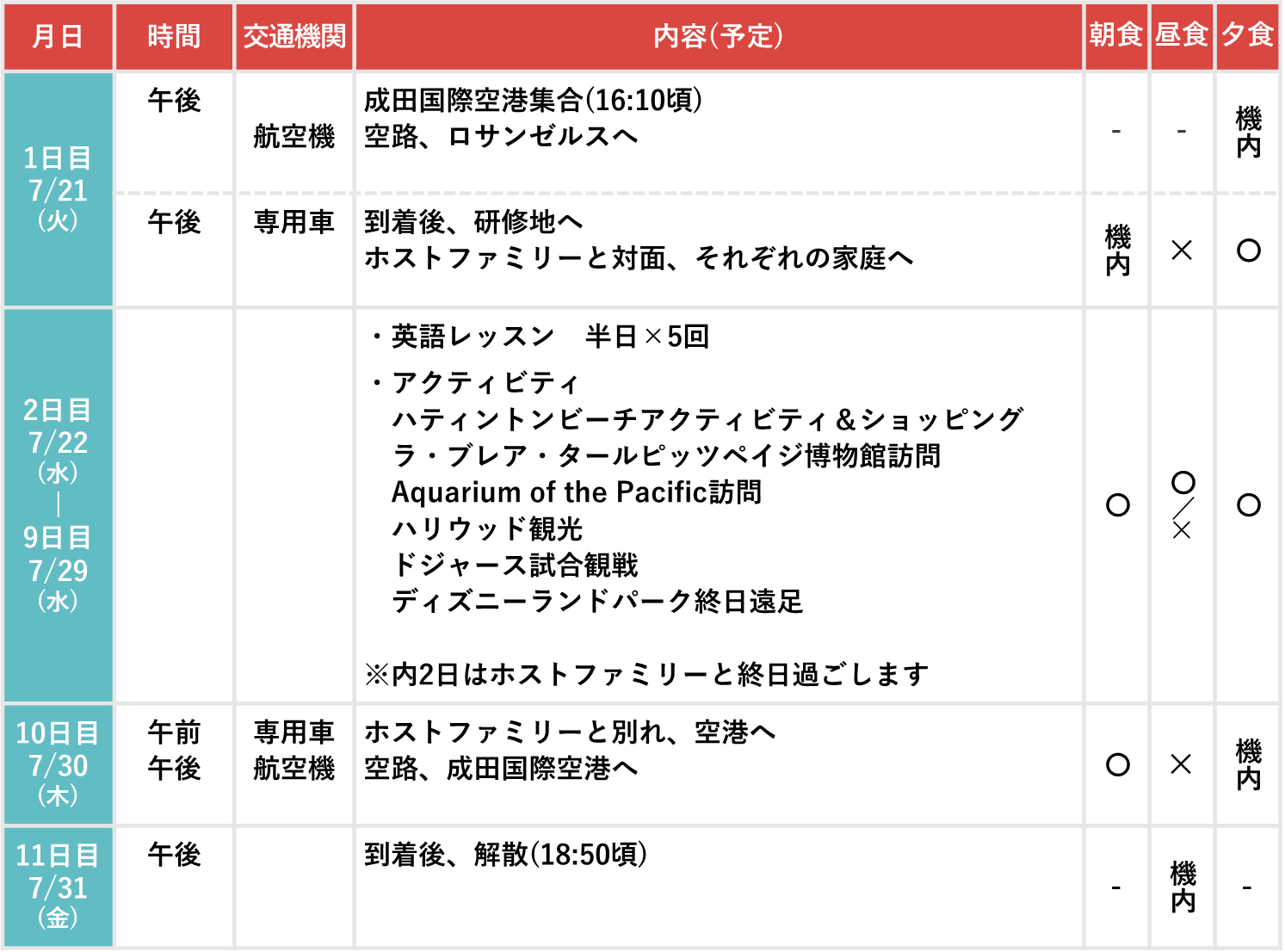 食事 [機内] 機内食 [○] 滞在先、手配あり [✕] 各自負担 (団体行動中に購入します)