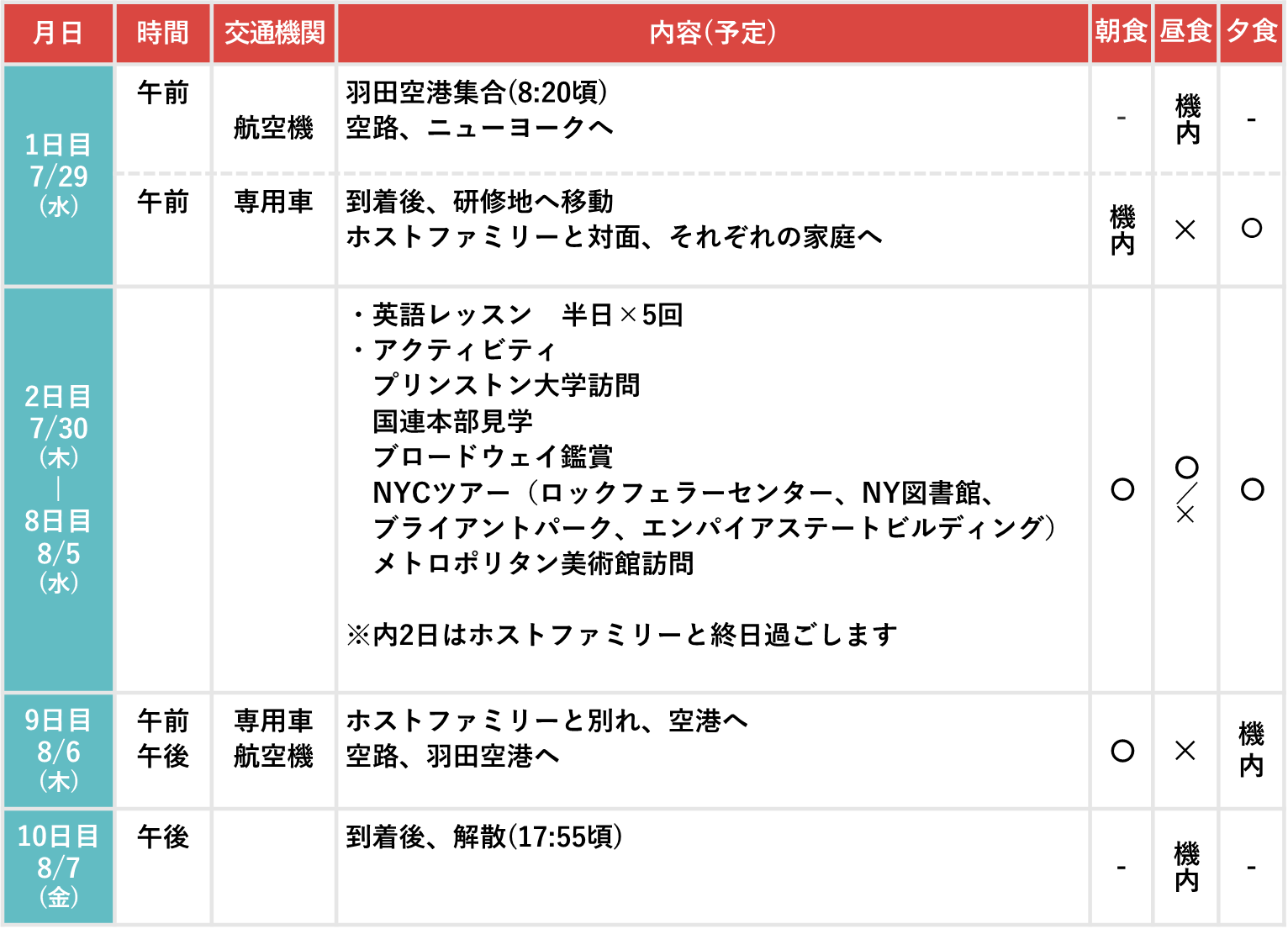 食事 [機内] 機内食 [○] 滞在先、手配あり [✕] 各自負担 (団体行動中に購入します)