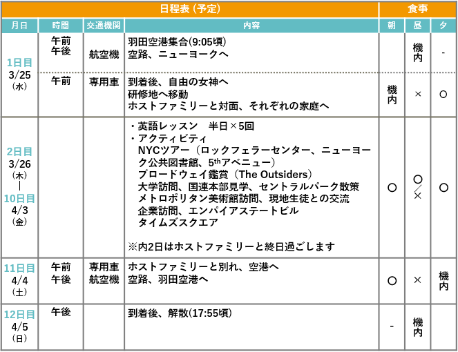 食事 [機内] 機内食 [○] 滞在先、手配あり [✕] 各自負担 (団体行動中に購入します)