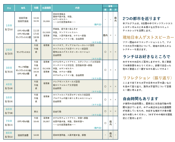 訪問予定先大学は、スタンフォード大学、サンタクララ大学、ディアブロバレーカレッジ、カリフォルニア大学バークレー校、カリフォルニア大学ロサンゼルス校、クレアモントスクールズ、南カリフォルニア大学。各大学の特徴を簡単にまとめていますので上記パンフレットよりご覧ください。